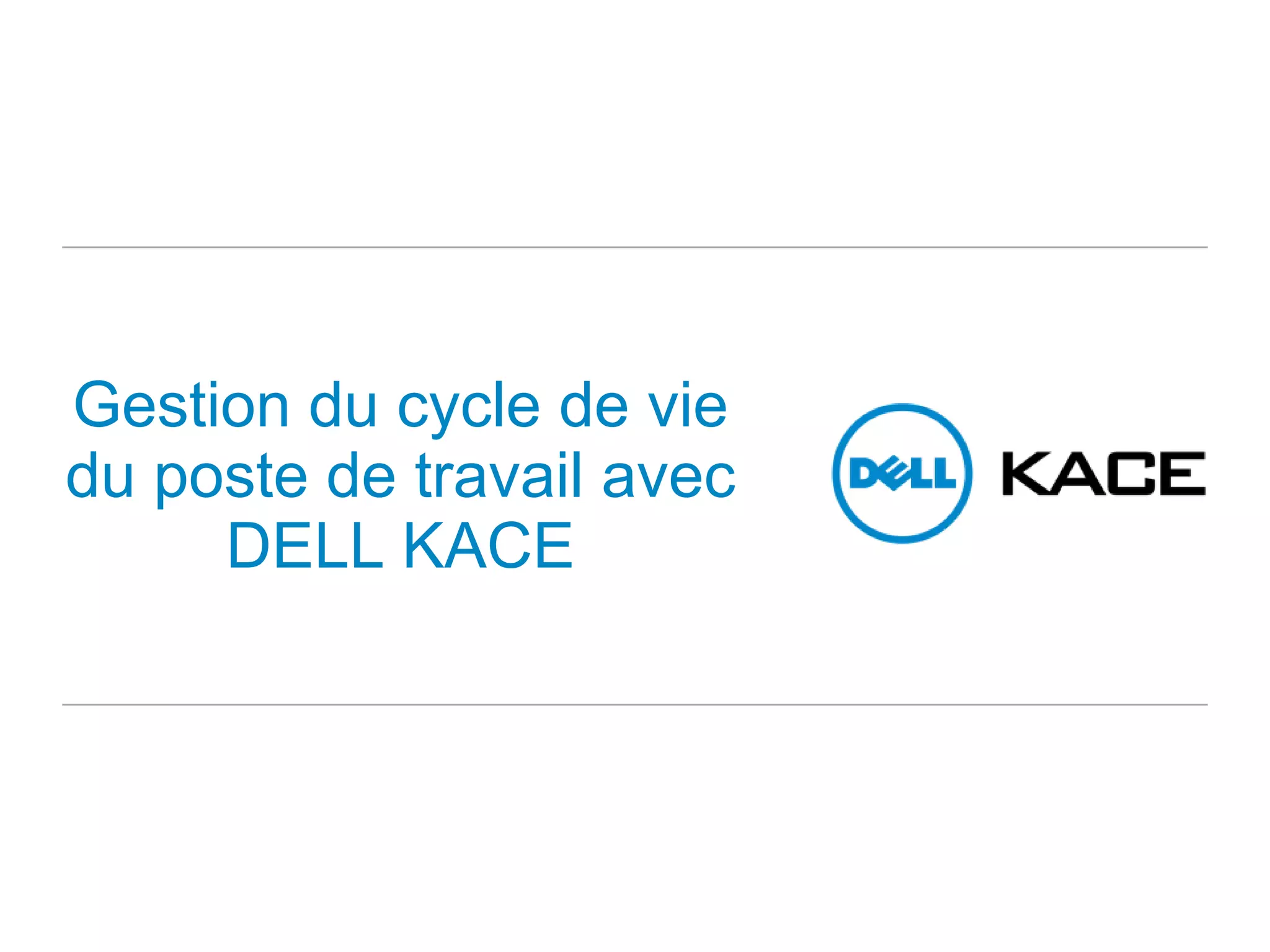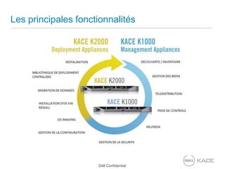 Le document décrit les principales fonctionnalités des appliances K1000 et K2000 de Dell Kace pour la gestion du cycle de vie des postes de travail, incluant l'inventaire matériel et logiciel, l'asset management, et la télédistribution d'applications. Il présente également la gestion de la sécurité, le helpdesk, et le provisioning de machines, tout en soulignant les éléments différenciateurs tels que l'intuitivité, la puissance fonctionnelle, et la personnalisation des rapports. La solution est conçue pour faciliter la gestion des actifs informatiques, assurer la conformité et améliorer l'efficacité des processus IT.