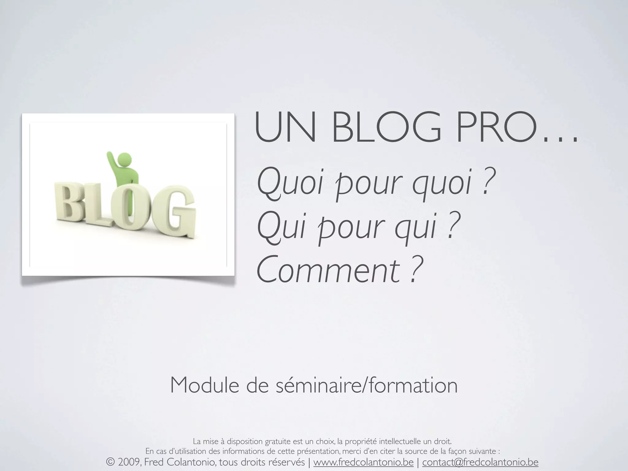 Ce document présente un séminaire sur la création et la gestion d'un blog professionnel, abordant des thèmes tels que la définition et les types de blogs, l'importance de la propriété intellectuelle, ainsi que des stratégies pour maximiser l'impact d'un blog. Il inclut également des chiffres sur l'utilisation des blogs en France et propose des exercices pratiques pour maîtriser les aspects techniques et rédactionnels. Enfin, un plan détaillant les différentes sections du séminaire est fourni.