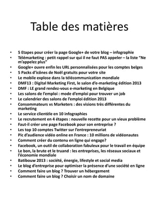 Le document est un recueil d'articles de blog sur divers sujets liés au marketing numérique, à la télémarketing et à des ressources pour créer des blogs et des sites web. Il couvre des événements comme le salon d'e-marketing DMF13 et aborde des thèmes tels que l'importance des réseaux sociaux, la personnalisation des URL sur Google+, et des ressources gratuites pour la décoration de sites web. En somme, il offre des conseils pratiques et des réflexions sur les tendances actuelles dans le domaine du marketing digital.