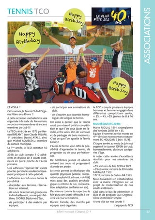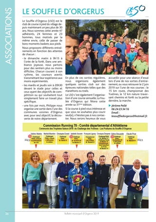 Le bulletin municipal d'Orgerus 2019 présente diverses associations sportives, notamment le club de course à pied 'Le Souffle d'Orgerus', le Tennis Club d'Orgerus, le club de tennis de table 'ATTO', et d'autres comme le karaté, le judo, et le muaythaï. Chaque association décrit ses activités, ses membres, et ses événements prévus tout au long de l'année, encourageant la participation des habitants. Ce document reflète l'engagement de la communauté dans les sports et les loisirs, favorisant le bien-être et la convivialité.