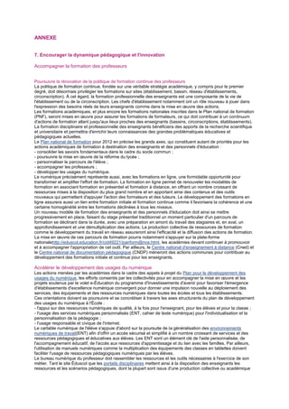 Le document présente des orientations pour la formation initiale et continue des enseignants, soulignant l'importance d'une meilleure complémentarité entre la théorie et la pratique. Il insiste sur l'utilisation accrue des outils numériques et la nécessité d'un accompagnement adapté pour répondre aux évolutions pédagogiques et aux besoins des élèves. En outre, il promeut l'innovation, l'expérimentation et l'évaluation comme des leviers essentiels pour améliorer les pratiques éducatives.