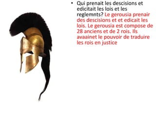 Le document traite de la cité-État de Sparte, sa structure politique et éducative, et les rôles des citoyens dans la société spartiate. Il souligne le rôle du Gerousia dans la prise de décision, l'éducation rigoureuse des jeunes garçons et le traitement des bébés selon des critères stricts. De plus, il évoque l'influence de Sparte sur notre société moderne, notamment en matière de démocratie et de gouvernance.