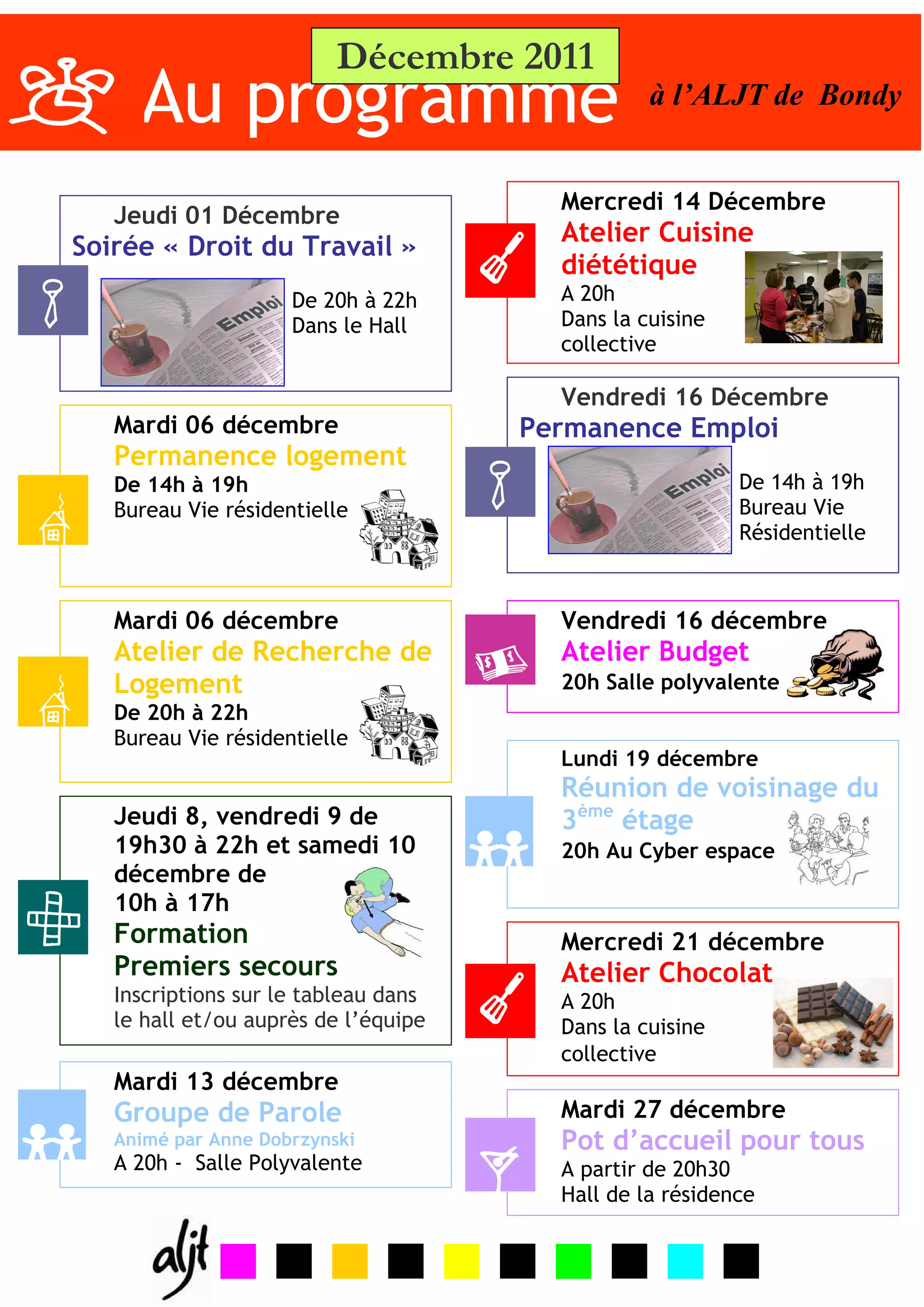 Le document présente le programme d'activités de l'aljt de Bondy pour décembre 2011, incluant des ateliers, des permanences, et des réunions. Les événements se déroulent à diverses dates et heures, avec des activités variées telles que des ateliers de cuisine, de recherche d'emploi et des formations. Un pot d'accueil est également prévu pour rassembler les résidents.