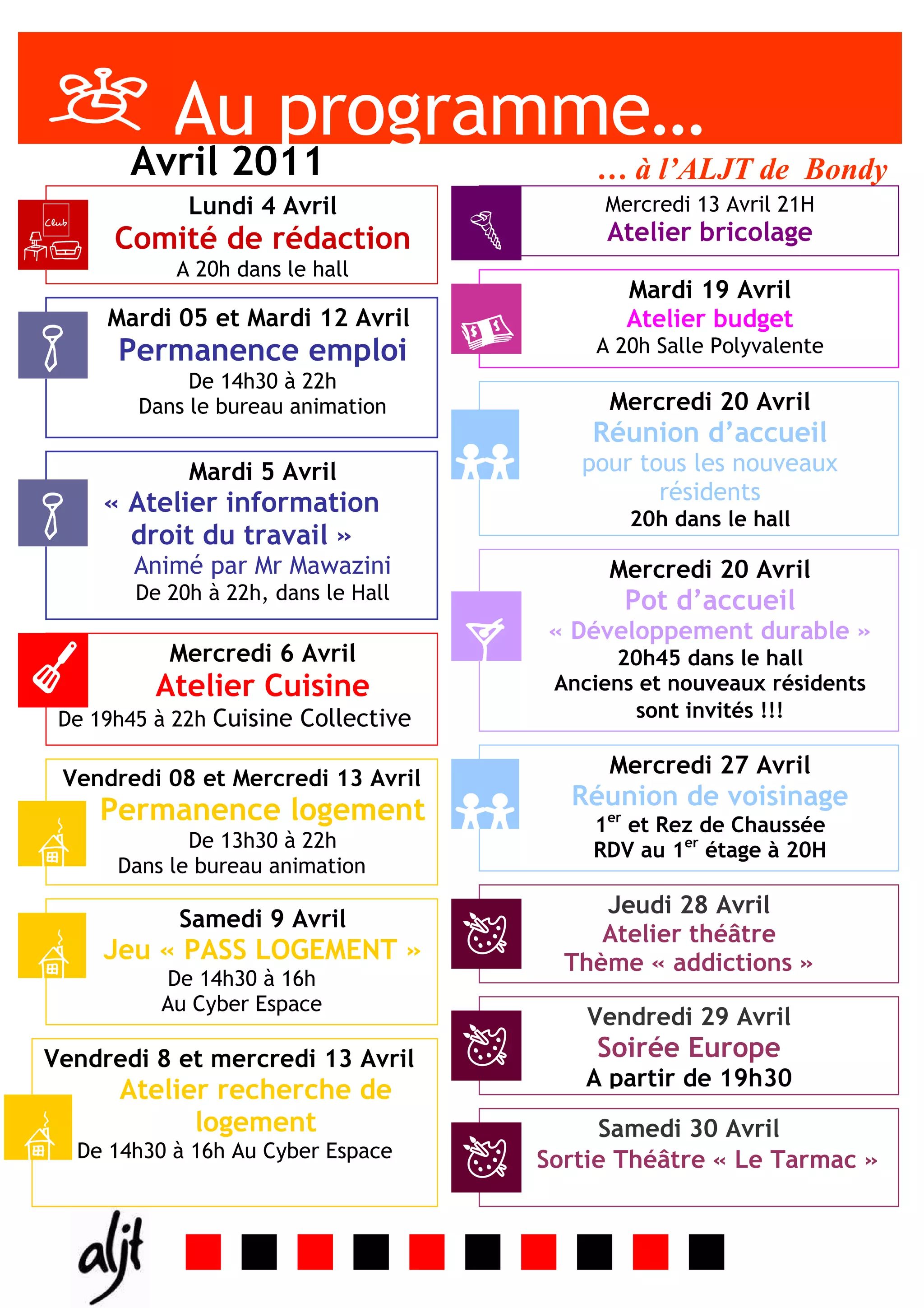 Le document présente un programme d'activités pour avril 2011 à l'aljt de Bondy, incluant des ateliers, des réunions et des événements divers. Des thèmes variés tels que le droit du travail, le développement durable et les addictions sont abordés. Les activités sont destinées aux résidents, avec des horaires et des lieux précisés pour chaque événement.