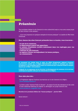 Ce document présente des bonnes pratiques pour la création et l'amélioration de sites internet des collectivités locales en Midi-Pyrénées. Il propose des exemples concrets, incluant des informations sur chaque commune, leurs caractéristiques, et des recommandations pour des contenus numériques accessibles et engageants. L'initiative fait partie d'un programme régional soutenu par l'Union européenne visant à promouvoir des services numériques de qualité.
