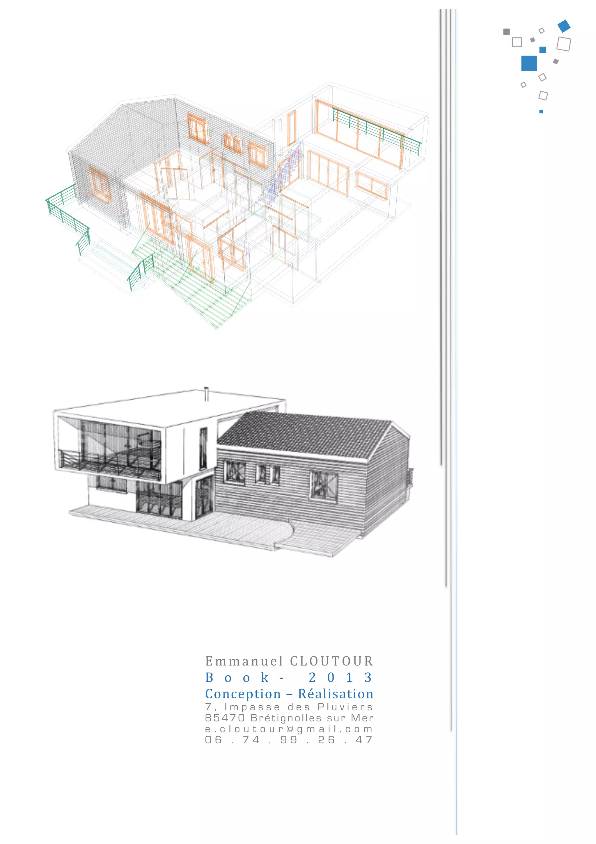 Le document présente différents projets de conception et de réalisation dans le domaine de la construction, notamment des agrandissements et des rénovations de maisons en Vendée. Il détaille les choix architecturaux et techniques, ainsi que des éléments de gestion de projet et des considérations environnementales. L'auteur, Emmanuel Cloutour, met en avant son expertise en matière de matériaux comme le bois et l'application de principes bioclimatiques.