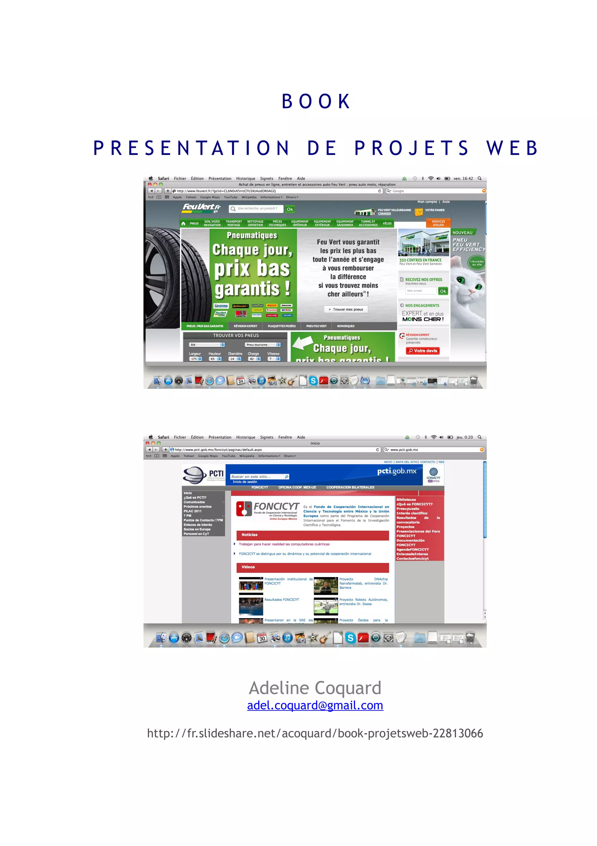 Ce document décrit la présentation de projets web réalisée par Adeline Coquard, axée sur son parcours professionnel et ses expériences en tant qu'assistante de projet. Il met en lumière deux projets spécifiques : un site e-commerce pour l'entreprise Feu Vert et un portail de coopération en technologie et innovation entre le Mexique et l'Union Européenne. Les compétences acquises incluent la gestion de projet, la coordination d'équipes et la création de contenu web.