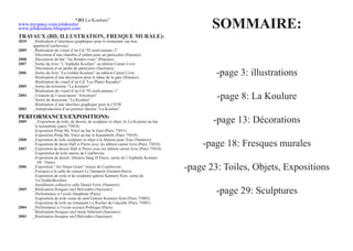 Le document présente le parcours artistique de Jo La Koulure, incluant sa réalisation de fresques murales, d'illustrations et de décorations entre 2003 et 2010. Il évoque ses expositions et performances, ainsi que sa passion pour le dessin, le graffiti et la sculpture. La synthèse met en avant ses productions, essaies de fanzine, et l'impact de son travail sur divers supports.