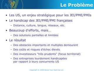 Le document présente un programme d'accompagnement pour les jeunes entreprises innovantes (JEI), petites et moyennes entreprises (PME) et petites et moyennes industries (PMI) françaises souhaitant se développer aux États-Unis, en mettant l'accent sur Silicon Valley. Il expose les défis rencontrés en raison de la distance culturelle et des différences linguistiques, tout en offrant une solution complète comprenant un management intérimaire et une équipe de consultants expérimentés. Le témoignage d'un client souligne l'efficacité de ce service dans la création rapide d'une filiale et l'atteinte des résultats commerciaux souhaités.