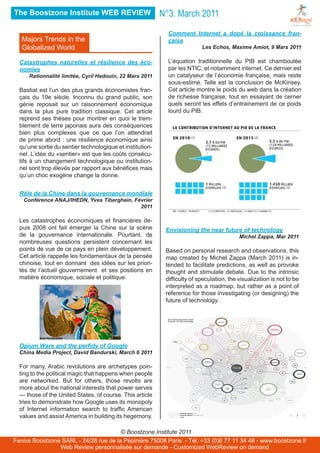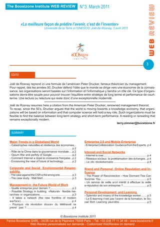 Le document présente divers sujets liés à l'évolution des organisations et à la gouvernance mondiale, mentionnant l'importance de l'économie de la connaissance et le rôle clé de l'information. Il aborde également l'impact d'Internet sur la croissance économique française et la nécessité pour les entreprises de s'adapter à un monde globalisé. En fin de compte, il souligne la résilience des économies face aux catastrophes et l'importance de l'innovation managériale.