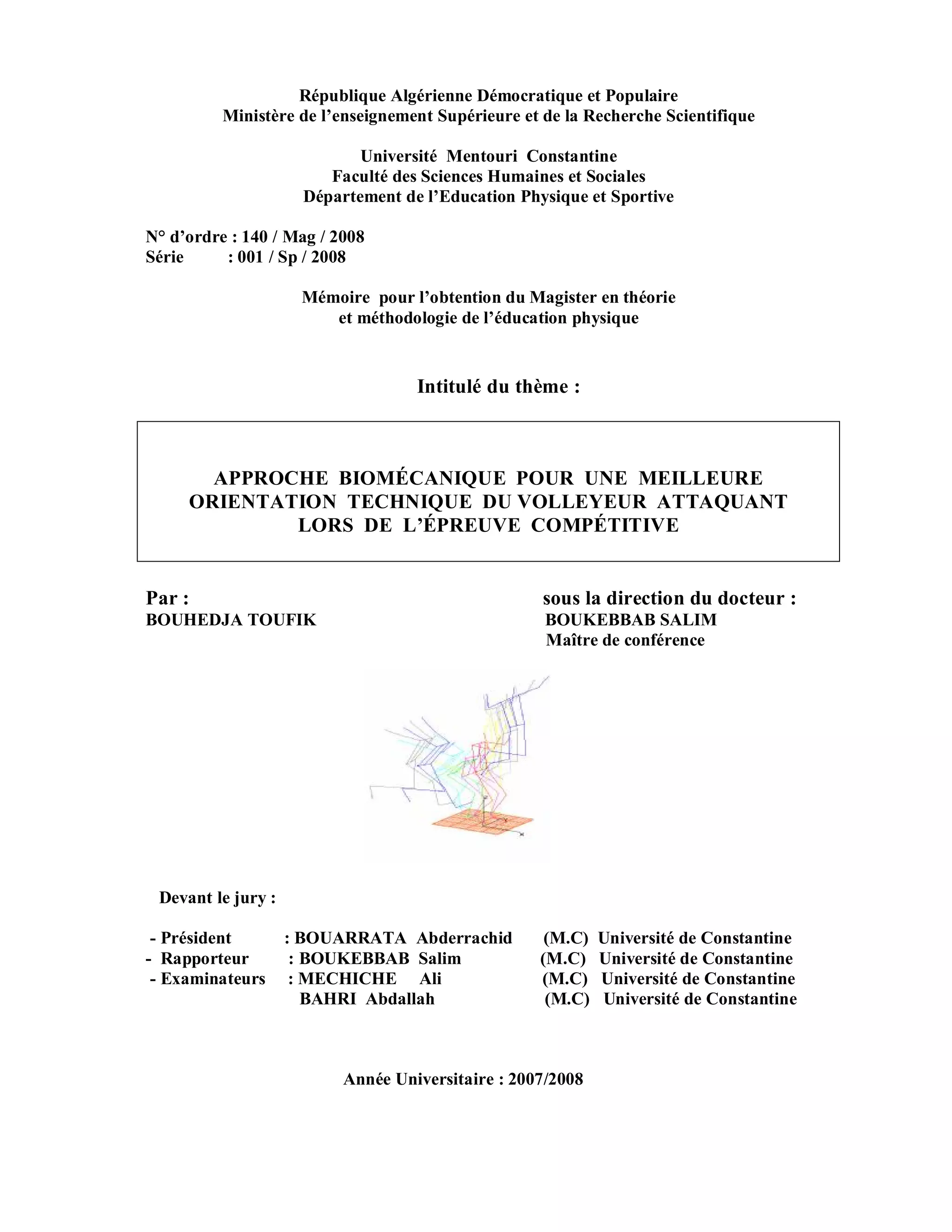 Ce mémoire de magister explore l'approche biomécanique pour améliorer l'orientation technique des volleyeurs attaquants lors des compétitions. Il examine les principes de la biomécanique, ainsi que les caractéristiques techniques et physiques du smash en volley-ball. L'étude inclut des analyses expérimentales et des interprétations des résultats obtenus avec des joueurs spécifiques.