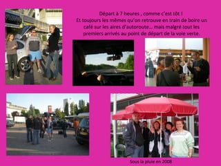Le document relate un week-end en Bourgogne des 20 et 21 juin 2009, avec des souvenirs de précédents événements en 2008. Les participants ont parcouru la voie verte reliant Chalon-sur-Saône à St Léger sur Dheune, entre activités variées comme des pique-niques et visites de cave. Le texte souligne l'ambiance conviviale, les rencontres et les anecdotes humoristiques des deux week-ends.