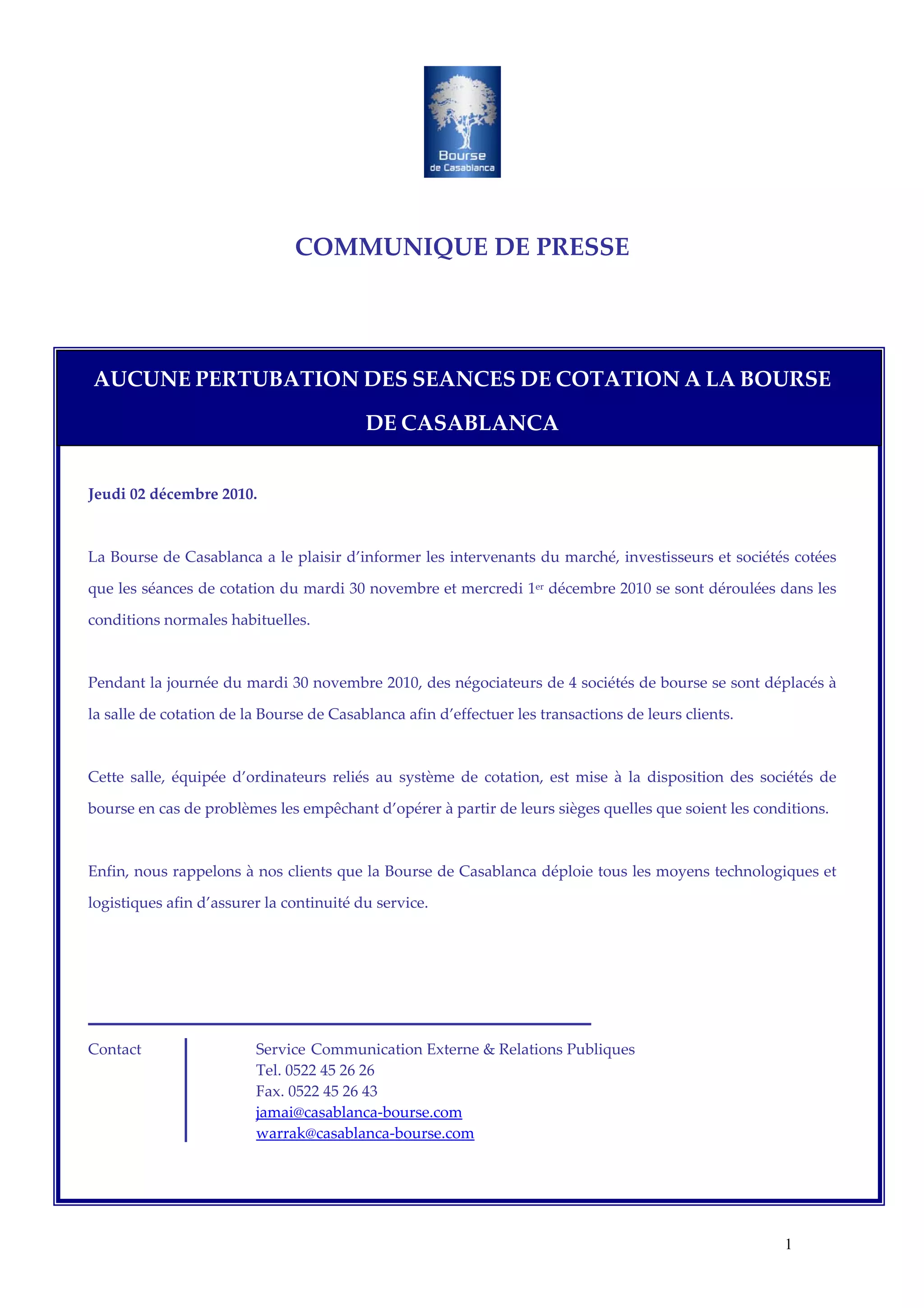 La Bourse de Casablanca a confirmé qu'aucune perturbation n'est survenue lors des séances de cotation des 30 novembre et 1er décembre 2010. Des négociateurs de 4 sociétés de bourse ont opéré normalement depuis la salle de cotation, qui est équipée pour assurer la continuité des opérations en cas de problème. La Bourse met en avant son engagement à utiliser des moyens technologiques et logistiques pour maintenir le service.