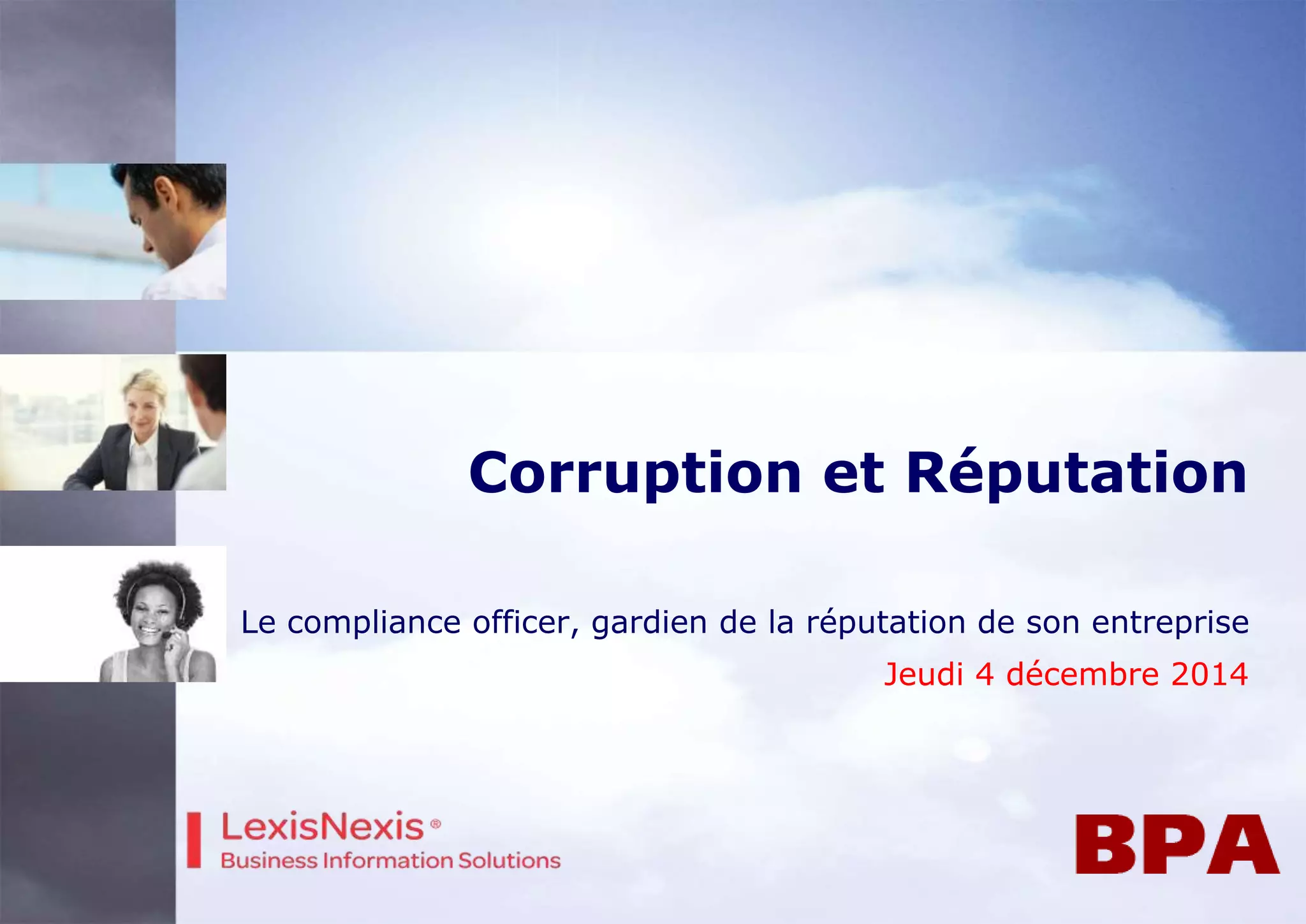 Le document traite de l'impact de la corruption sur la réputation des entreprises, soulignant le rôle essentiel du compliance officer en tant que gardien de cette réputation. Il aborde les conséquences directes et indirectes de la corruption, les enjeux liés à la gouvernance, et l'importance du reporting en matière de conformité. Enfin, il met en avant la valorisation des marques et les attentes sociétales croissantes concernant la responsabilité éthique des entreprises.
