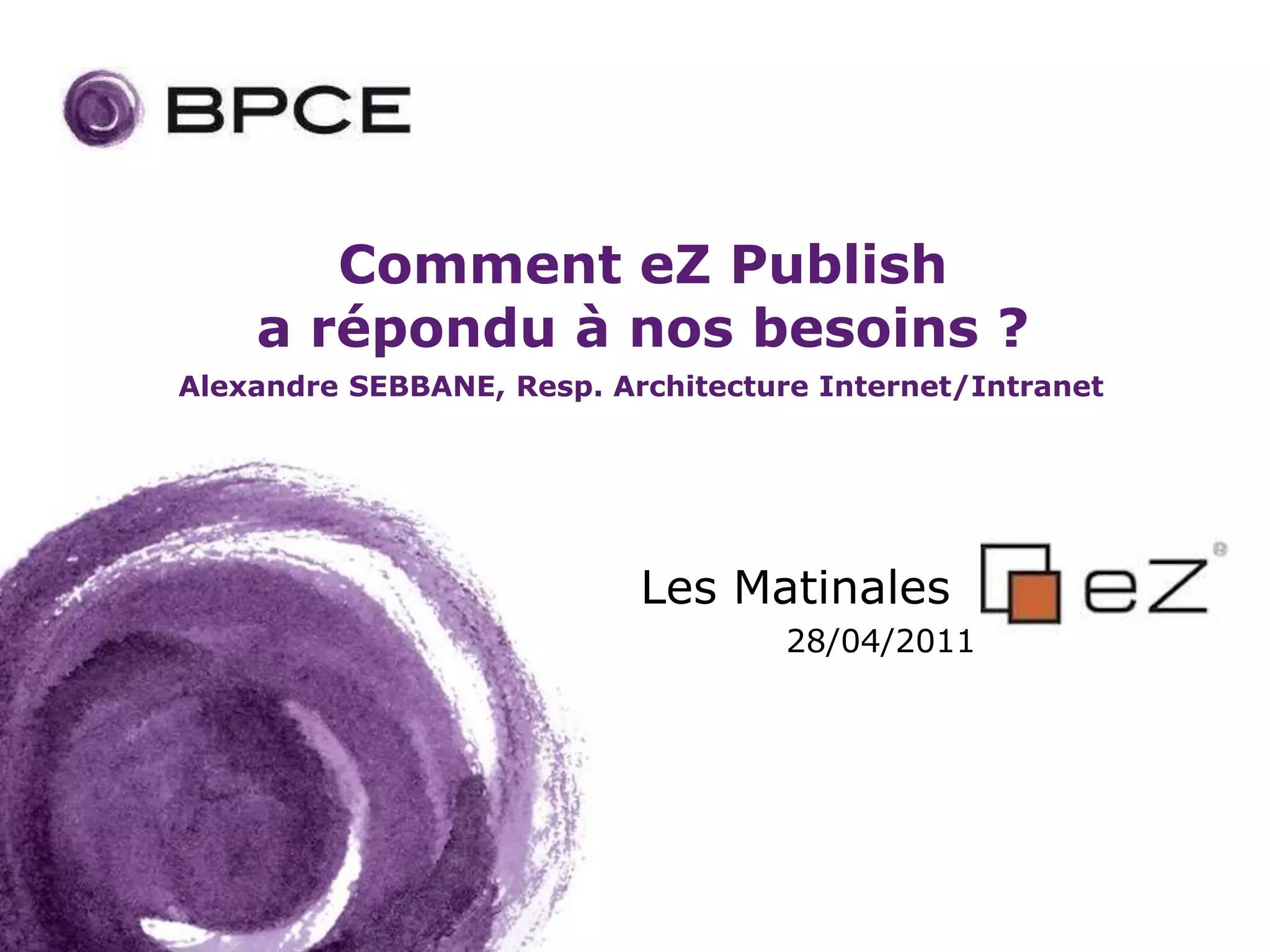 Le document présente comment le groupe BPCE a utilisé Ez Publish pour répondre à ses besoins en matière de plateformes intranet, internet et extranet. Cela inclut la mise en place d'une usine à sites permettant la gestion de plusieurs sites avec des fonctionnalités variées adaptées à leurs exigences spécifiques. Ez Publish a ainsi facilité l'administration, la contribution et le respect des chartes de design tout en assurant la sécurité et l'évolutivité des plateformes.