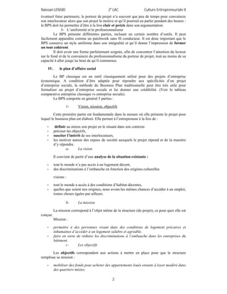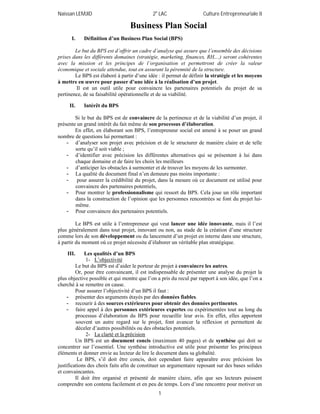 Le document décrit le business plan social (BPS) comme un cadre d'analyse permettant de structurer un projet entrepreneurial en cohérence avec la mission de son organisation, favorisant ainsi la création de valeur économique et sociale. Il souligne l'importance de l'objectivité, de la clarté et du professionnalisme dans l'élaboration du BPS pour convaincre les partenaires potentiels et garantir la viabilité du projet. Le BPS se compose de plusieurs parties essentielles, notamment la définition de la vision, mission et objectifs, ainsi qu'une analyse de l'opportunité et une stratégie économique.