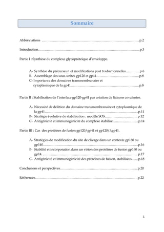 Le document présente un rapport bibliographique sur la formation du complexe glycoprotéique du VIH-1, en décrivant des processus tels que la synthèse, le clivage des protéines gp120 et gp41, et l'importance de leurs interactions pour l'infection virale. Il souligne les défis de développement d'un vaccin efficace contre le VIH-1, en mettant l'accent sur la nécessité d'induction d'anticorps neutralisants à large spectre dirigés contre les protéines d'enveloppe. Enfin, il aborde les modifications post-traductionnelles et la stabilisation des complexes d'enveloppe comme des aspects cruciaux pour la recherche vaccinale.