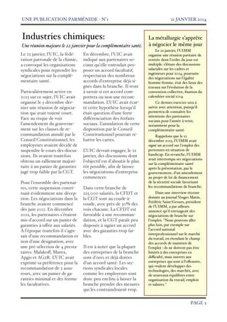 Le document aborde les futurs décrets du gouvernement concernant la complémentaire santé et les obligations des entreprises, notamment en matière de garanties de remboursement. Il fait état des négociations en cours dans la branche de la chimie et de la métallurgie, avec des organisations syndicales et des employeurs, sur des paniers de garanties à offrir aux salariés. Ce cadre légal cherche à articuler les obligations des branches et des contrats responsables tout en prévoyant des discussions pour établir des accords adaptés aux besoins des entreprises et des salariés.