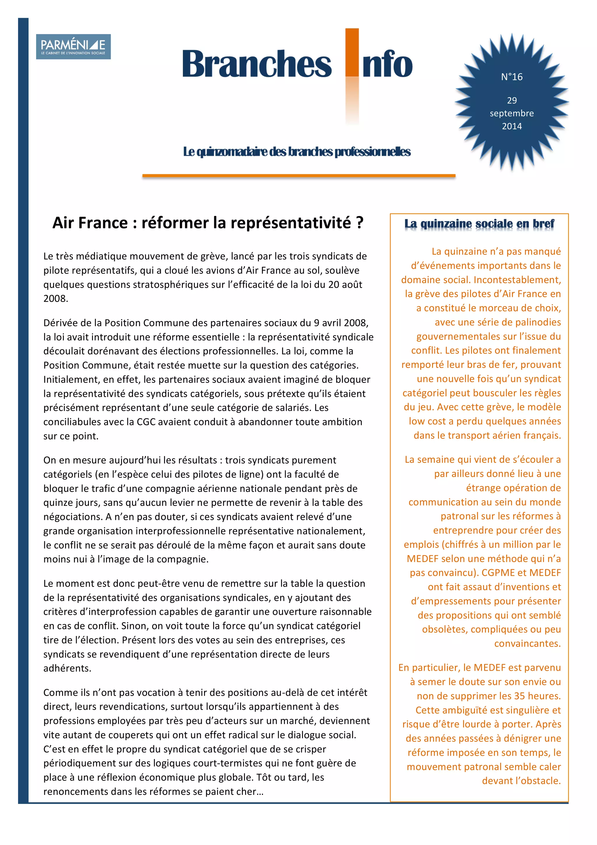 La publication 'Branches Info' aborde plusieurs sujets sociaux récents, dont la grève des pilotes d'Air France qui remet en question la loi sur la représentativité syndicale, soulignant la force des syndicats catégoriels. Le texte critique également la politique de santé actuelle, accusant l'État de favoriser les hélicoptères publics au détriment de l'hospitalisation privée. Enfin, diverses négociations de branche sont en cours sur des sujets de prévoyance et de santé, avec des accords en passe d'être étendus.