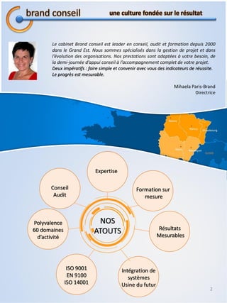 Le cabinet Brand Conseil, leader en conseil, audit et formation depuis 2000, se spécialise dans la gestion de projet et l'évolution des organisations dans le Grand Est. Il propose des prestations sur mesure adaptées aux besoins de ses clients, avec un engagement sur la qualité et des indicateurs de réussite mesurables. L'équipe se concentre sur des solutions simples et personnalisées, valorisant l'humain au cœur de l'organisation.