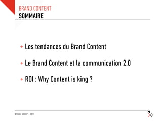 Le document traite du concept de brand content, soulignant son importance dans la communication moderne et l'engagement des marques avec leur communauté. Il explore aussi les différentes stratégies de création et de curation de contenu, ainsi que l'importance de mesurer le retour sur investissement des efforts de contenu. Enfin, il présente des exemples concrets de marques utilisant le brand content avec succès.