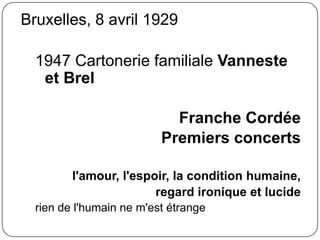Jacques Brel, né à Bruxelles en 1929, est un chanteur et songwriter emblématique connu pour ses thèmes tels que l'amour, l'espoir et la condition humaine, avec des chansons célèbres comme 'Ne me quitte pas' et 'Amsterdam'. Il a influencé de nombreux artistes à travers le monde et a connu un parcours musical riche, avec des concerts à travers plusieurs pays. Sa carrière s'est étendue jusqu'à sa mort en 1978, marquant durablement la scène musicale française.