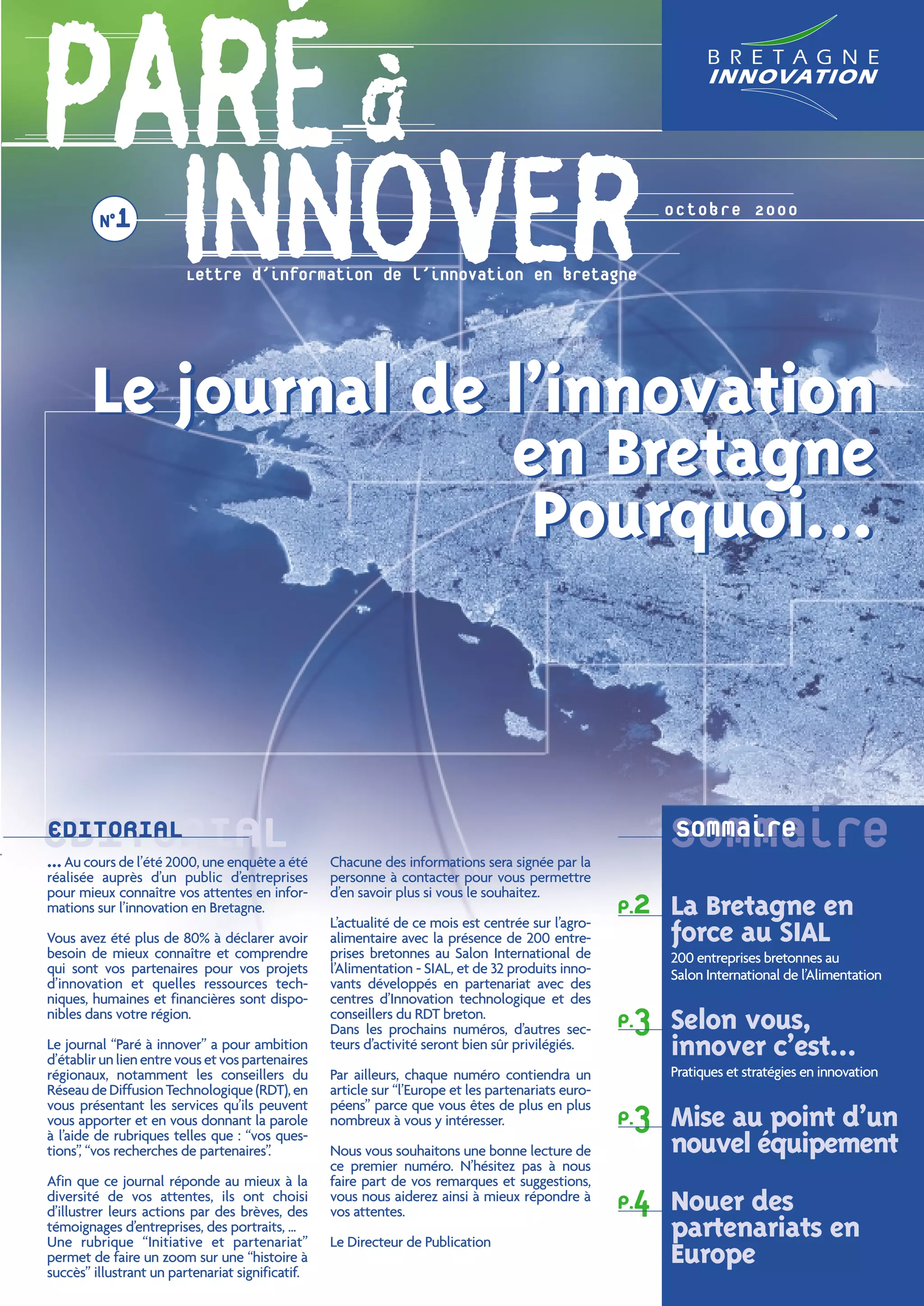 Le document présente le premier numéro de la lettre d'information 'Paré à Innover' sur l'innovation en Bretagne, soulignant des initiatives dans les secteurs agro-alimentaire et technologique. Il informe sur des événements comme le salon SIAL et met en avant des produits innovants ainsi que des partenariats établis entre entreprises et centres de recherche. Le journal cherche à créer des liens entre entreprises et acteurs régionaux pour favoriser l'innovation et recueillir les retours des lecteurs pour améliorer son contenu.
