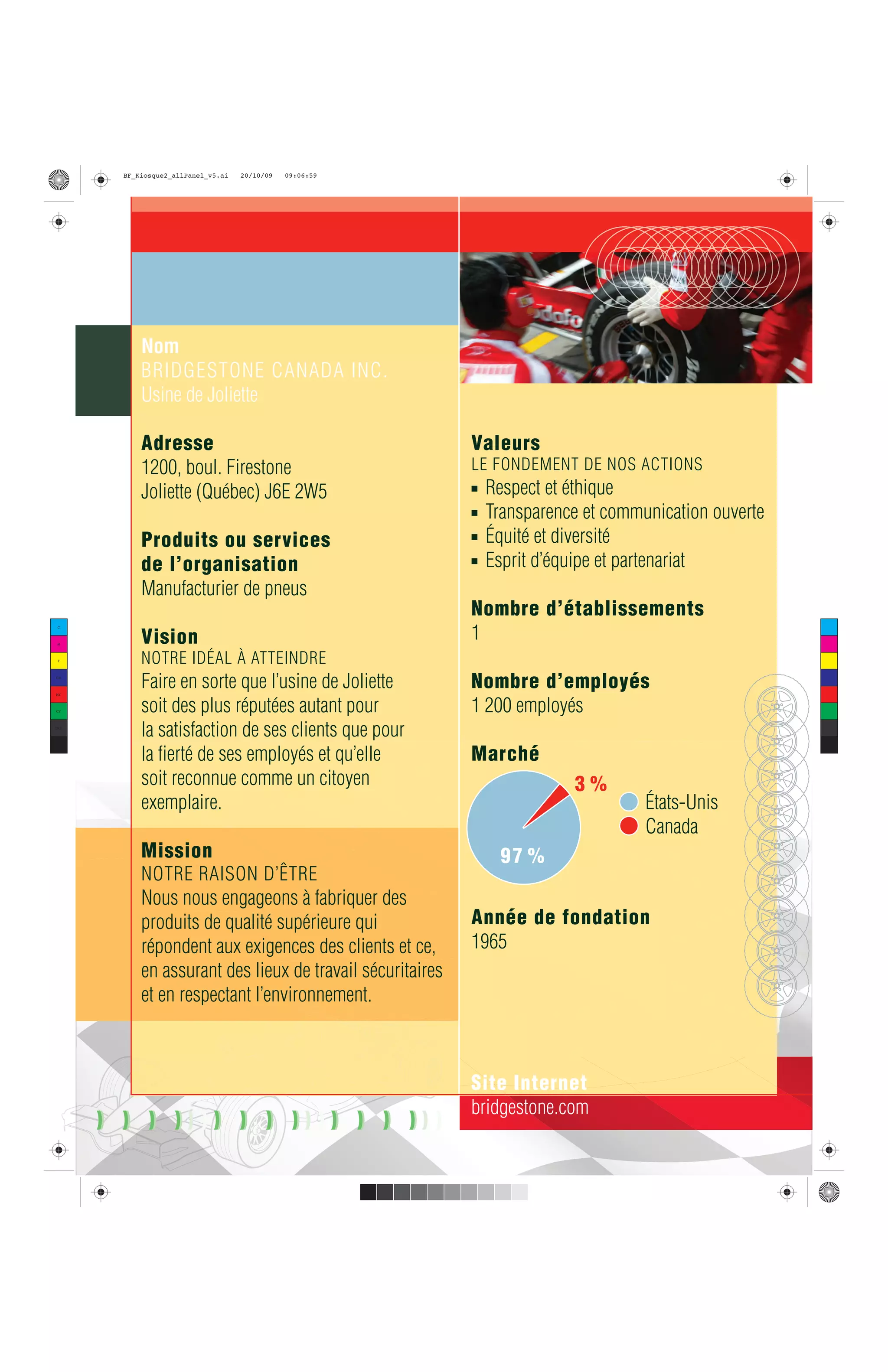 Bridgestone Canada Inc. à Joliette s'engage à produire des pneus de haute qualité tout en garantissant des conditions de travail sécurisées et respectueuses de l'environnement. L'approche Suru-Raku, axée sur la standardisation et l'implication des employés, vise à améliorer l'efficacité opérationnelle et la satisfaction client par le biais d'une gestion continue des normes. Ce processus a permis de réaliser d'importantes économies et d'obtenir la reconnaissance comme meilleur projet de standardisation en Amérique du Nord en 2009.
