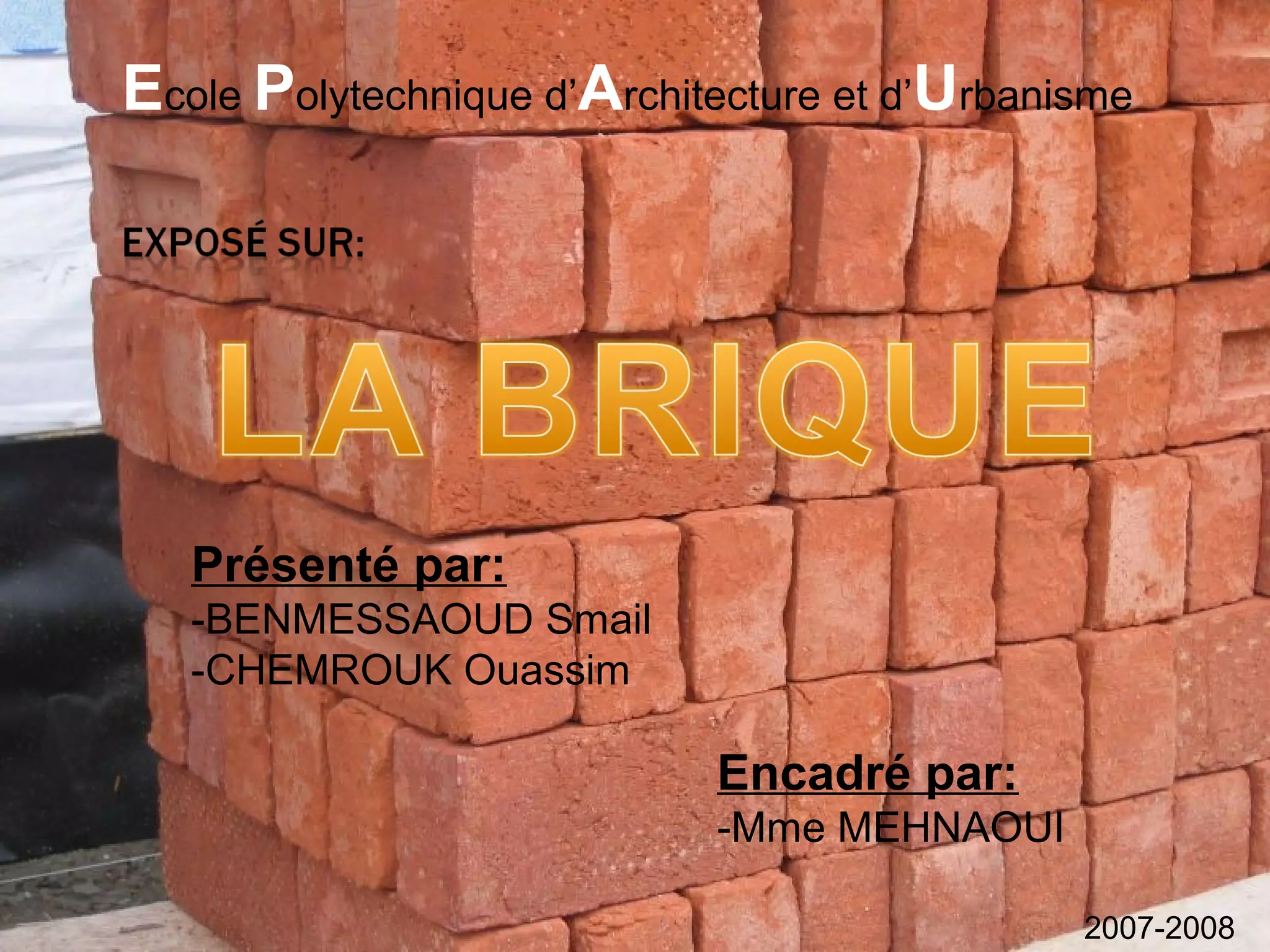 Le document présente une étude sur la fabrication et les caractéristiques des briques, matériaux céramiques datant de 7000 ans avant J.-C. et largement utilisés dans la construction. Il détaille l'historique de la brique, les différentes méthodes de fabrication, ainsi que ses applications en tant que matériau de construction, soulignant sa résistance, son isolation thermique et acoustique, et ses propriétés esthétiques. Enfin, le texte aborde les différentes techniques de maçonnerie avec des briques, incluant la maçonnerie traditionnelle et collée.