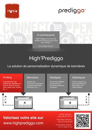 High'Prediggo est une solution de monétisation dynamique pour e-commerçants, proposant des bannières publicitaires personnalisées en fonction des préférences des utilisateurs. Elle gère plus de 20 stratégies de promotion et permet un suivi des gains en temps réel via un back-office. L'objectif est de maximiser les revenus publicitaires en associant le bon message à la bonne personne.
