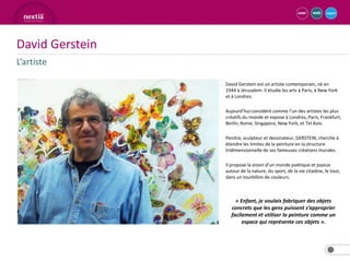 David Gerstein est un artiste contemporain né en 1944 à Jérusalem, reconnu pour ses créations murales tridimensionnelles qui fusionnent art et objets concrets dans un style poétique. Influencé par l'op art, son travail évoque le mouvement et la couleur, tout en étant en lien avec la vie urbaine et moderne. Ses œuvres récentes sont largement diffusées dans des publicités pour des entreprises telles qu'Ahava et Isracard.