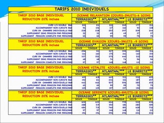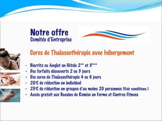 L'offre de thalassothérapie inclut des séjours dans des hôtels de Biarritz et Anglet avec des forfaits de 2 à 6 jours, comprenant des soins variés et des réductions pour groupes. Les clients bénéficient d'accès gratuit aux installations de remise en forme et à des activités aquatiques, ainsi que d'un service de réservation personnalisé. Des soins spécifiques et des promotions sont disponibles, tout en mettant l'accent sur le bien-être des clients dans un cadre de haute qualité.