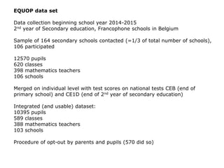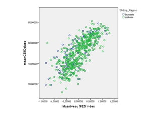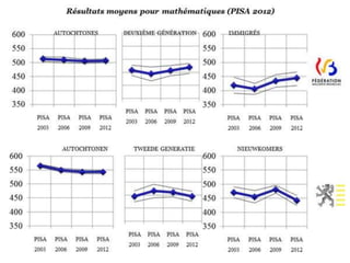 Le document présente une étude sur la performance scolaire des élèves dans les écoles francophones en Belgique, en se basant sur un échantillon de 106 écoles et de 10 395 élèves. Les résultats indiquent une corrélation significative entre le statut socio-économique et les performances en mathématiques, ainsi qu'une variabilité dans les ressources des équipes enseignantes selon la concentration d'élèves à risque. Des données sur le retard scolaire et l'impact des origines socio-économiques et migratoires sont également discutées.