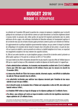 La fondation ifrap anticipe un risque de dérapage budgétaire pour 2016 de plus de 10 milliards d'euros, principalement dû à des hypothèses macroéconomiques optimistes. Le document souligne que la maîtrise des dépenses publiques est délicate, surtout en raison de la nécessité de renforcer les budgets pour la sécurité publique. La projection actuelle du déficit public pourrait être plus élevée que prévu, atteignant 3,56 % du PIB plutôt que les 3,3 % annoncés par le gouvernement.