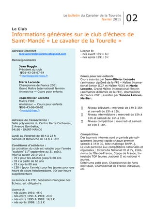 Le bulletin du Cavalier de la Tourelle de février 2011 présente les activités et résultats récents du club d'échecs de Saint-Mandé, y compris le 17ème tournoi des enfants. Il annonce également un tournoi des familles prévu pour le 6 mars 2011, ainsi que des cours pour enfants animés par des maîtres internationaux. Le club s'est bien classé lors de compétitions récentes et encourage la participation des jeunes dans les événements à venir.