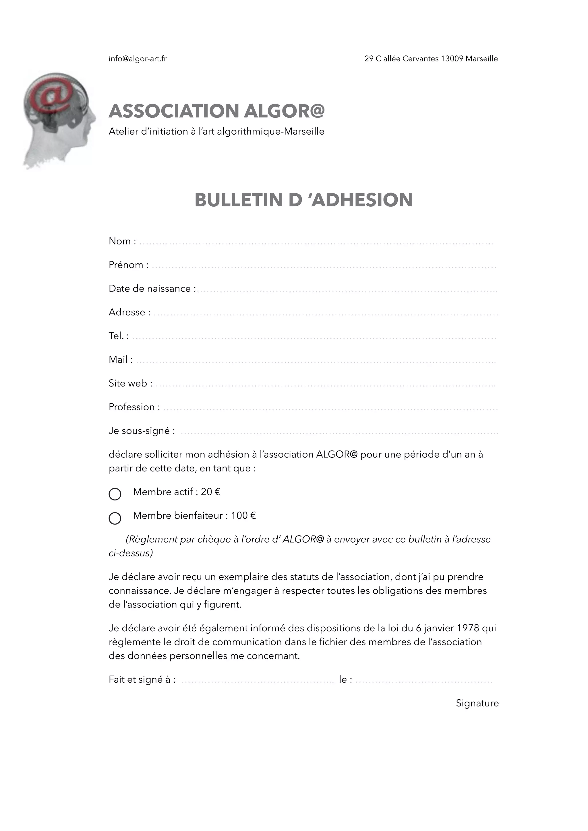 Le document est un bulletin d'adhésion à l'association Algor@, permettant aux intéressés de devenir membres actifs ou bienfaiteurs pour une période d'un an. Il inclut des informations personnelles à renseigner et détaille les conditions d'adhésion ainsi que le respect des statuts de l'association et des obligations légales. Le paiement se fait par chèque à l'ordre de l'association, à envoyer à l'adresse indiquée.