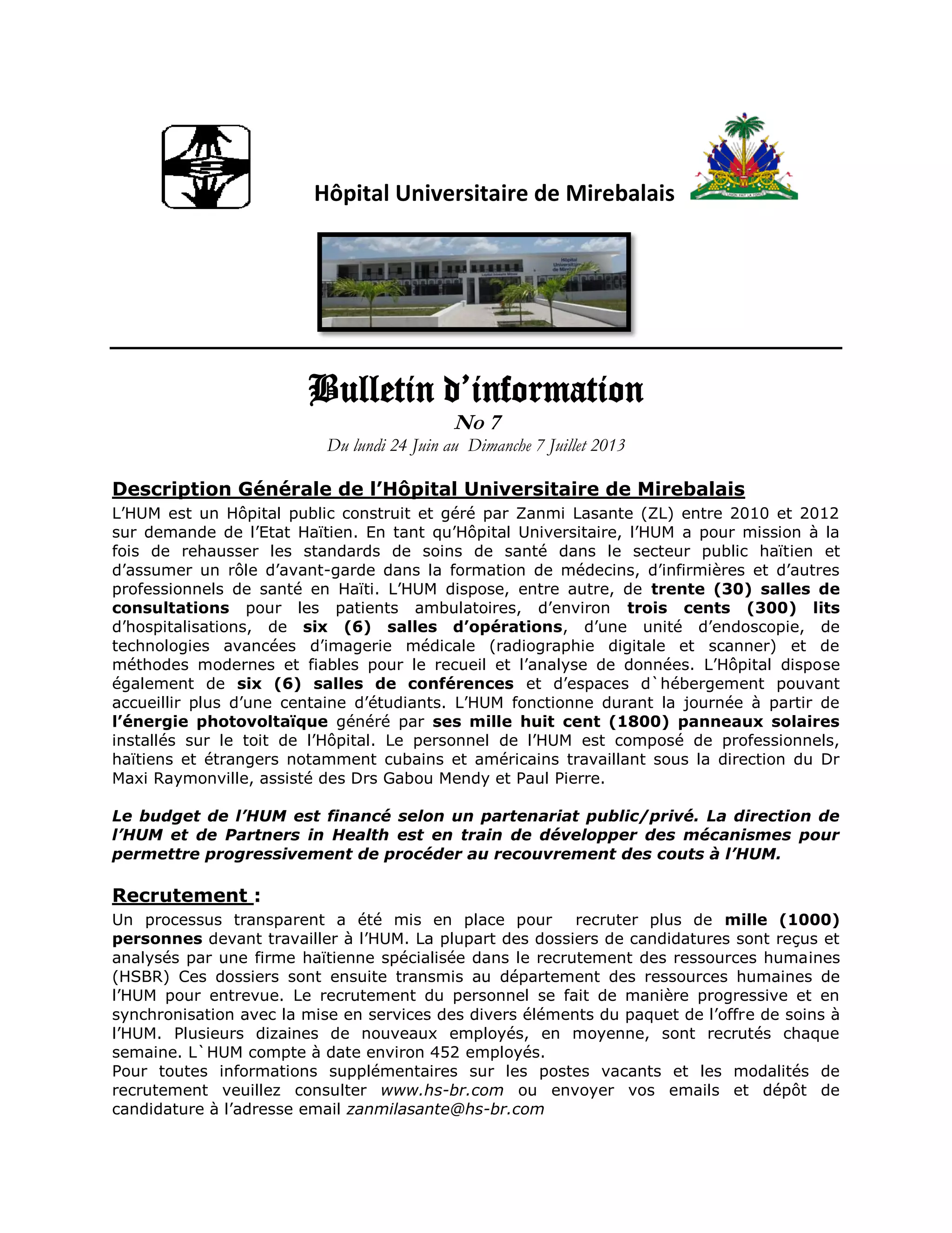 L'Hôpital Universitaire de Mirebalais (HUM), construit entre 2010 et 2012, a pour mission d'améliorer les soins de santé en Haïti et de former des professionnels de santé. Actuellement, 452 employés y travaillent, avec des services ambulatoires et d'hospitalisation offerts, et un processus de recrutement actif pour soutenir l'expansion des services. L'HUM se prépare à ouvrir de nouveaux départements, dont l'odontologie et l'oncologie, avec une moyenne de 500 patients traités par jour en clinique externe.
