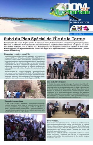 En octobre 2014, une délégation dirigée par le coordonnateur du plan spécial de l'île de la Tortue, Klaus Eberwein, et la ministre du tourisme, Stéphanie Balmir Villedrouin, a visité l'île pour discuter d'un projet d'infrastructure de croisière de 70 millions de dollars avec 'Carnival Corporation'. Ce projet vise à améliorer les conditions de vie des habitants, revigorer l'économie locale et promouvoir le tourisme, tout en mettant l'accent sur l'implication des population locale. Les membres de la délégation ont également exploré des sites patrimoniaux et touristiques de l'île.