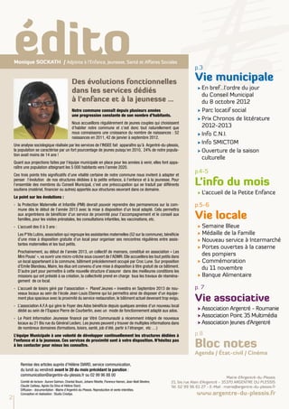 Le document présente des évolutions concernant l'accueil de la petite enfance à Argentré-du-Plessis, avec une augmentation des naissances et l'ouverture prochaine d'une micro-crèche. Le conseil municipal souhaite développer continuellement les structures dédiées à l'enfance et à la jeunesse, tout en fournissant différents soutiens aux associations locales. Des événements culturels et des initiatives pour les familles sont également évoqués dans ce journal municipal.