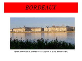 Bordeaux est une commune du sud-ouest de la France, chef-lieu de la région Aquitaine et préfecture de la Gironde, avec une population de 235 178 habitants. La ville est réputée pour son vignoble et possède une riche histoire remontant au moins au Ve siècle av. J.-C., marquée par des monuments célèbres et une topographie favorable à la viticulture. En dépit de la nécessité d'une grande salle de concert, Bordeaux continue d'accueillir de nombreux événements dans des installations variées.