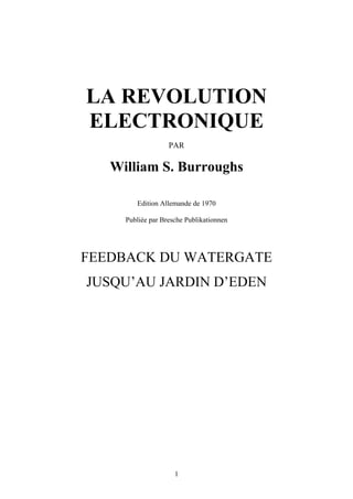 Dans 'La révolution électronique', William S. Burroughs explore la nature du langage et de l'écriture, soutenant que l'écriture est essentielle à la transmission des connaissances humaines. Il établit un parallèle entre le langage et les virus, suggérant que les mots peuvent agir de manière contagieuse et manipulative dans la société, en particulier dans le contexte politique. L'œuvre aborde également des techniques de playback pour influencer et contrôler les comportements sociaux, mettant en lumière une critique de la manipulation médiatique et politique.