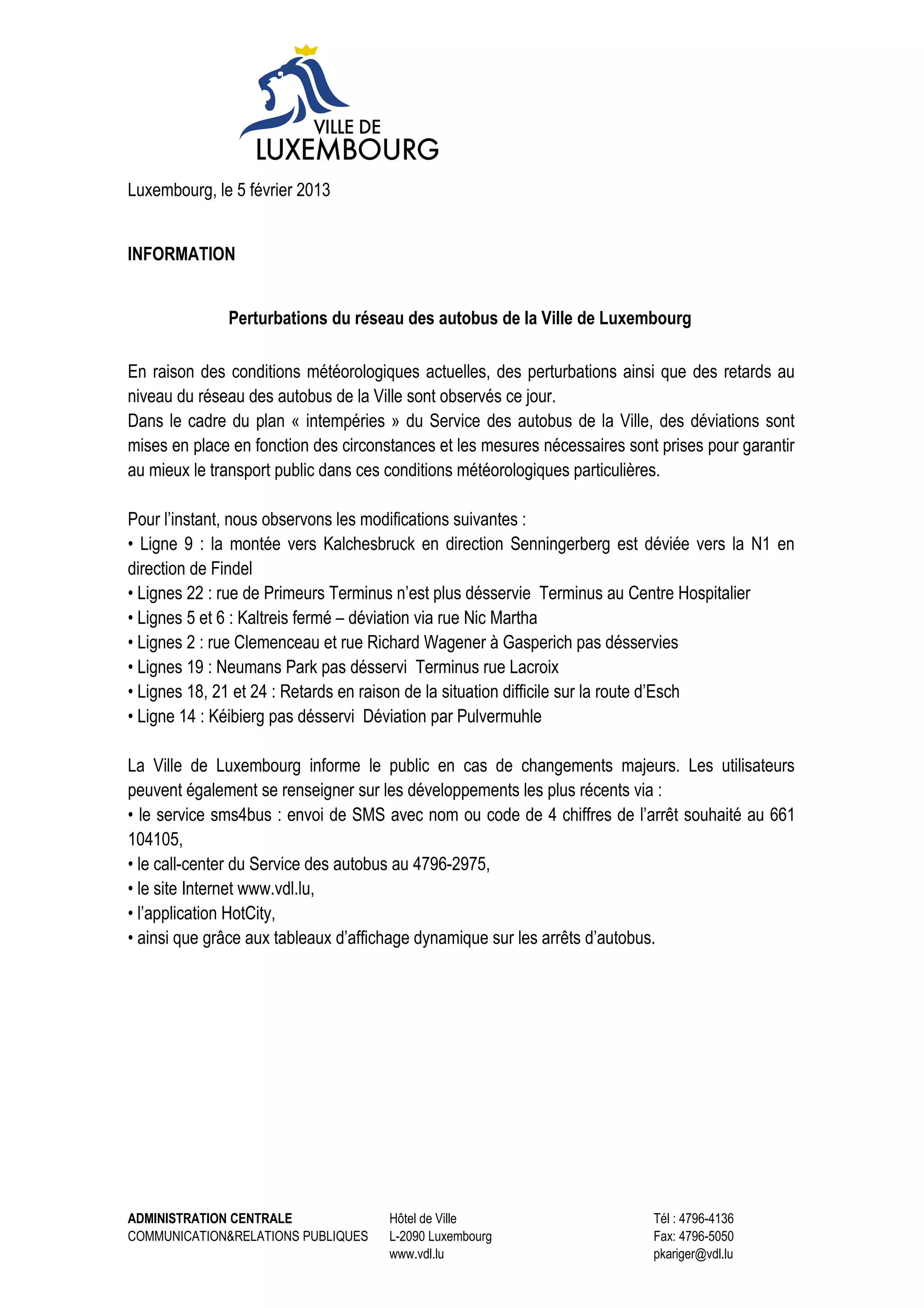 Des perturbations et retards affectent le réseau des autobus de la ville de Luxembourg en raison des conditions météorologiques actuelles. Des déviations sont mises en place sur plusieurs lignes pour garantir le transport public, notamment la ligne 9 déviée vers la N1 et des arrêts non desservis sur d'autres lignes. Le public est informé des changements via différents moyens, y compris le service SMS, un call-center, et le site internet.