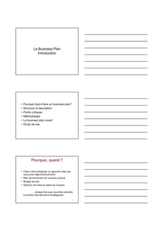 Le document fournit un guide sur la rédaction d'un business plan essentiel pour la création ou l'expansion d'une entreprise. Il couvre la structure, les avantages, les points critiques et des conseils méthodologiques pour convaincre les investisseurs et les établissements financiers. En outre, il met en avant l'importance d'une présentation soignée et d'une analyse approfondie des données financières et stratégiques.