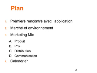 Le document décrit les étapes clés pour élaborer un business plan d'une application mobile, incluant une première rencontre, l'analyse du marché, et les stratégies de marketing mix. Il aborde des éléments essentiels tels que la conception de produits, la politique de prix, les canaux de distribution, et la communication à travers divers médias. En conclusion, il souligne l'importance de la communication pour assurer le succès d'une application sur le marché.