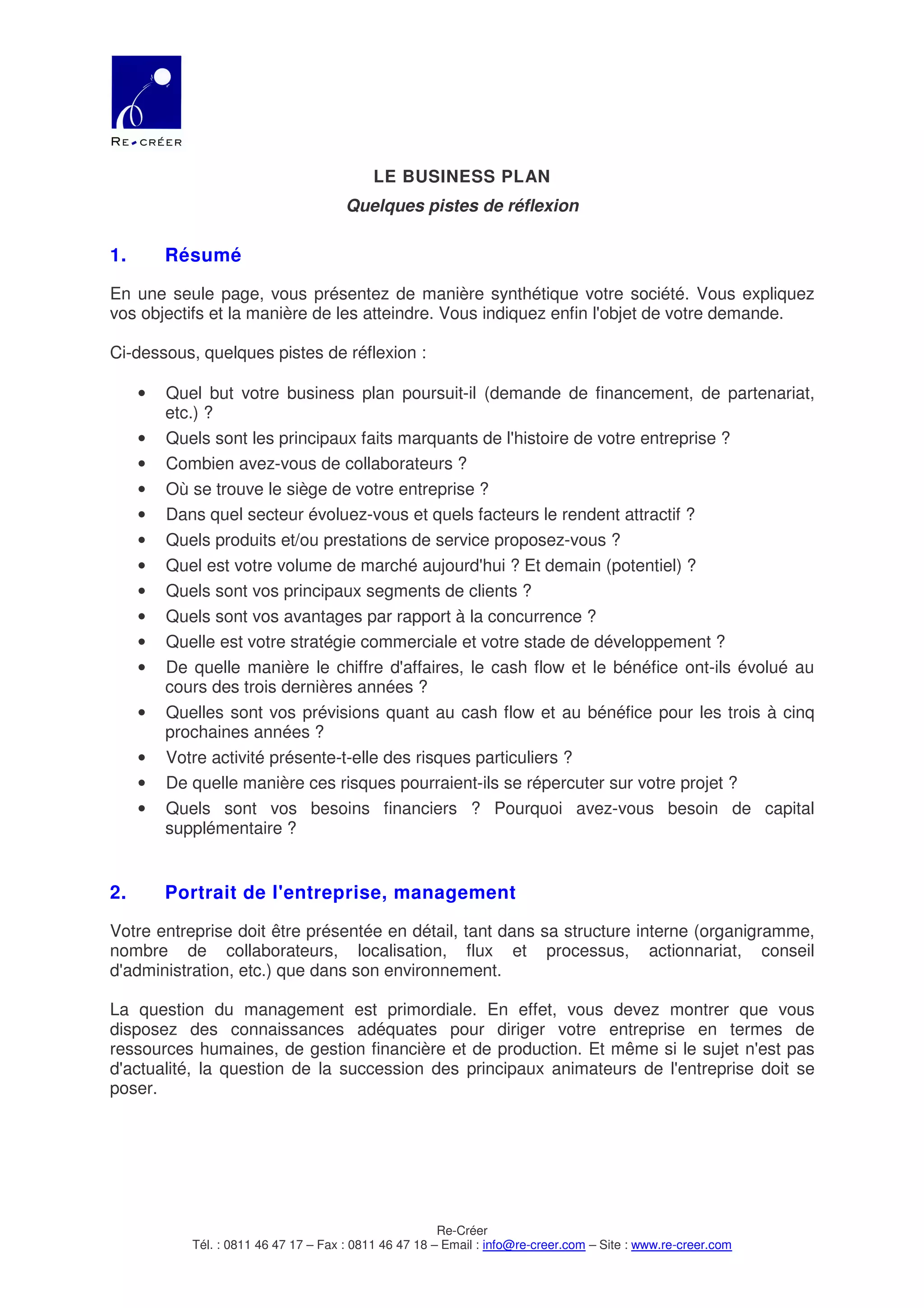 Le document présente les éléments essentiels à inclure dans un business plan, tels que la présentation de l'entreprise, l'analyse de marché, et la stratégie financière. Il aborde les aspects de gestion, y compris la concurrence et les risques associés, ainsi que la nécessité d'annexes pour compléter le dossier. Enfin, il souligne l'importance d'une planification financière rigoureuse pour assurer la pérennité de l'entreprise.