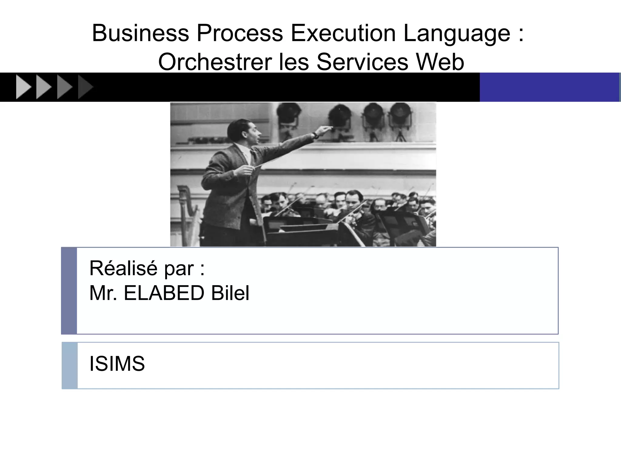 Le document traite de l'exécution des processus métiers à l'aide du Business Process Execution Language (BPEL) pour orchestrer des services web. Il présente divers scénarios pratiques, notamment l'inscription d'étudiants et l'abonnement au transport de bus, tout en soulignant les défis d'intégration et les capacités offertes par BPEL pour gérer des processus de plus en plus complexes. Enfin, le document explique la structure essentielle de BPEL, ses composants, et les outils nécessaires pour le développement et l'exécution de processus BPEL.