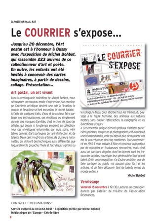 Le magazine Bussyscope n°159 présente des événements culturels à Bussy, notamment une exposition d'art postal de Michel Bohbot, une collecte d'objets pour une bourse, et un spectacle de Richard Bohringer. Des activités pour les enfants et des soirées thématiques complètent le programme, avec une attention particulière sur la célébration de traditions locales. L'entrée est généralement libre ou payante selon les événements, et des informations de contact sont fournies pour les réservations.
