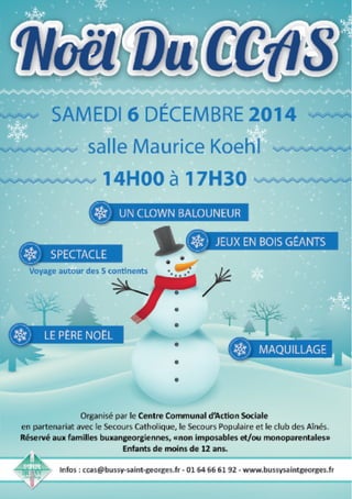 Le magazine culturel Bussy Mag n° 169 de novembre 2014 met en avant un appel au don et au bénévolat pour le Secours Catholique, axé sur les femmes et la pauvreté, tout en présentant divers événements festifs à venir pour préparer Noël. Il annonce également des séjours d'hiver pour les jeunes, ainsi que des animations et spectacles culturels, dont un Téléthon célébrant la solidarité. La publication fait la promotion de la culture, de l'entraide et des activités pour tous les âges dans la communauté.