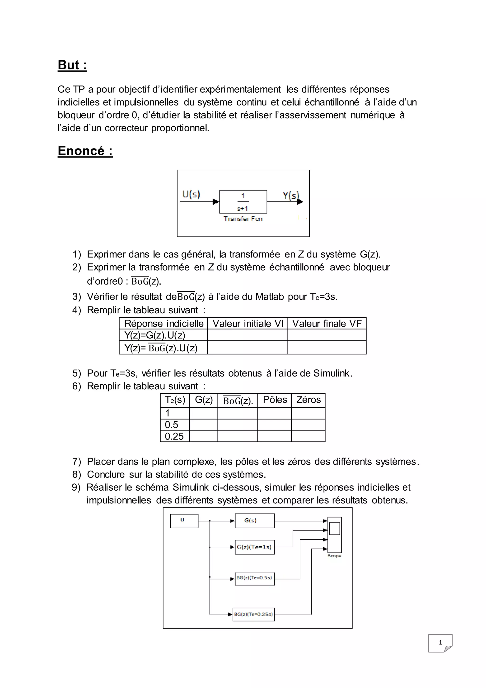 Ce document décrit un travail pratique visant à analyser un système continu et échantillonné à travers des réponses indicielle et impulsionnelle, en utilisant des outils MATLAB et Simulink. Il couvre l'analyse de la stabilité des systèmes et la conception d'un correcteur proportionnel pour le contrôle numérique. Les résultats obtenus montrent que tous les systèmes examinés sont stables, et l'impact du gain sur l'erreur statique est également discuté.