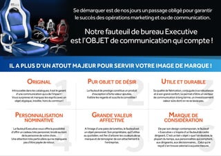 Le fauteuil personnalisé est un outil de communication puissant qui renforce l'image de marque grâce à sa personnalisation et à sa qualité. Destiné principalement aux dirigeants, il sert de symbole de prestige tout en offrant confort et durabilité. Cet objet unique et atypique constitue un investissement à long terme et marque les esprits par sa capacité d'attirer l'attention.